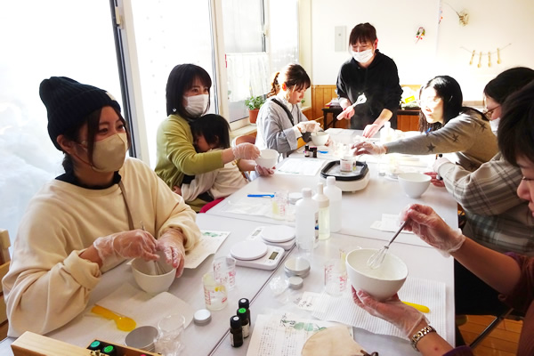 ・手作り広場 ・ベビーマッサージ ・栄養士による離乳食講座 ・アロマ教室 等など… 季節に合わせた工作や裁縫でおもちゃの手作りや、講師をお迎えして母と子どもの触れ合いを育むベビマ等の講座があります。